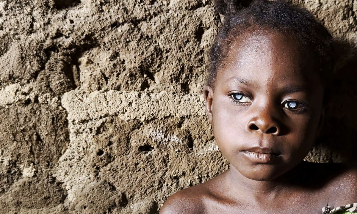 Ein kleines Mädchen mit auffallend weißen Pupillen lehnt sich in einem Raum an eine gemauerte Wand.